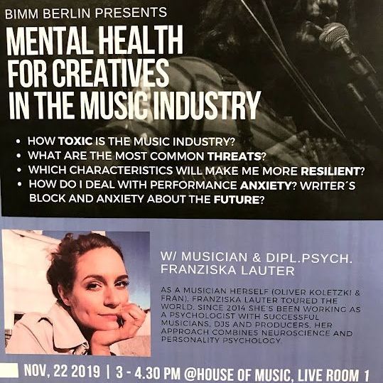 34% der „touring professionals“ leiden an einer klinischen Depression. 69% der MusikerInnen unter Ängsten. Sagen die Studien… - und das vor Corona. Was ist da los? Dass die Musikbranche sehr stressig und durchaus psychisch belastend ist, wissen alle, die in ihr arbeiten. Dass sie auch krank machen kann, wird glücklicherweise in der letzten Zeit immer offener besprochen. Unser Workshop / Vortrag "Mental Health in der Musikbranche" gibt einen Überblick zum Status Quo der mentalen Gesundheit in der Musikbranche. Die Ergebnisse der wichtigsten weltweiten Studien zu diesem Themen werden von uns prägnant zusammengefasst. Wir stellen daran anknüpfend die spezifischen Risikofaktoren für die mentale und körperliche Gesundheit (Arbeitsbedingungen, Persönlichkeitsfaktoren, individuelle Motive und Mechanismen der Branche) vor. Und natürlich schauen wir auch nach vorne! Wie kann es besser werden?
